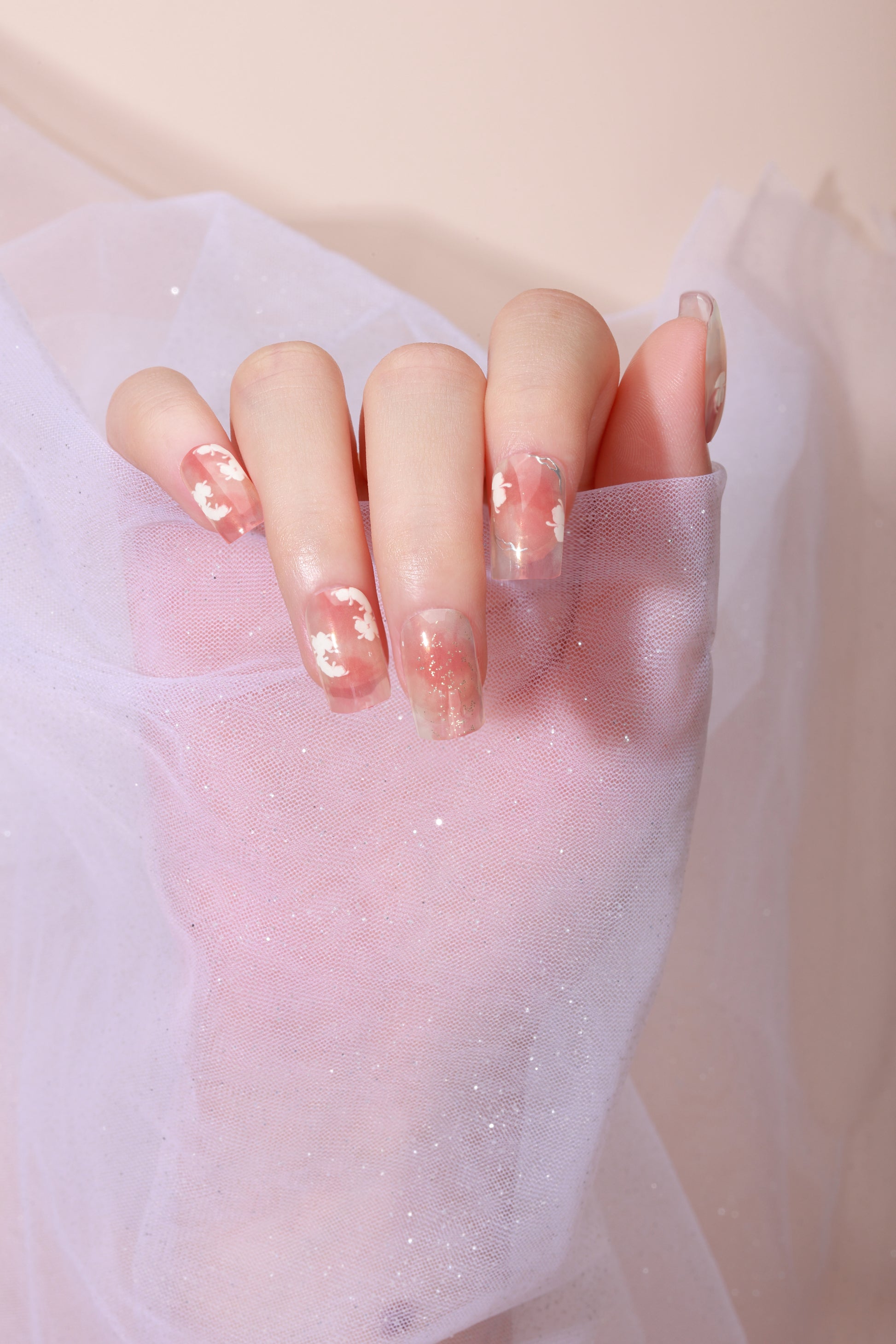 Soft pink watercolor base with delicate white blossoms and a touch of golden sparkle—fresh, dreamy, and graceful.