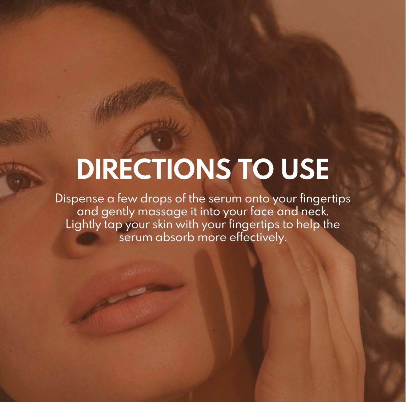 Dispense a few drops of the serum onto your fingertips and gently massage it into your face and neck. Lightly tap your skin with your fingertips to help the serum absorb more effectively.