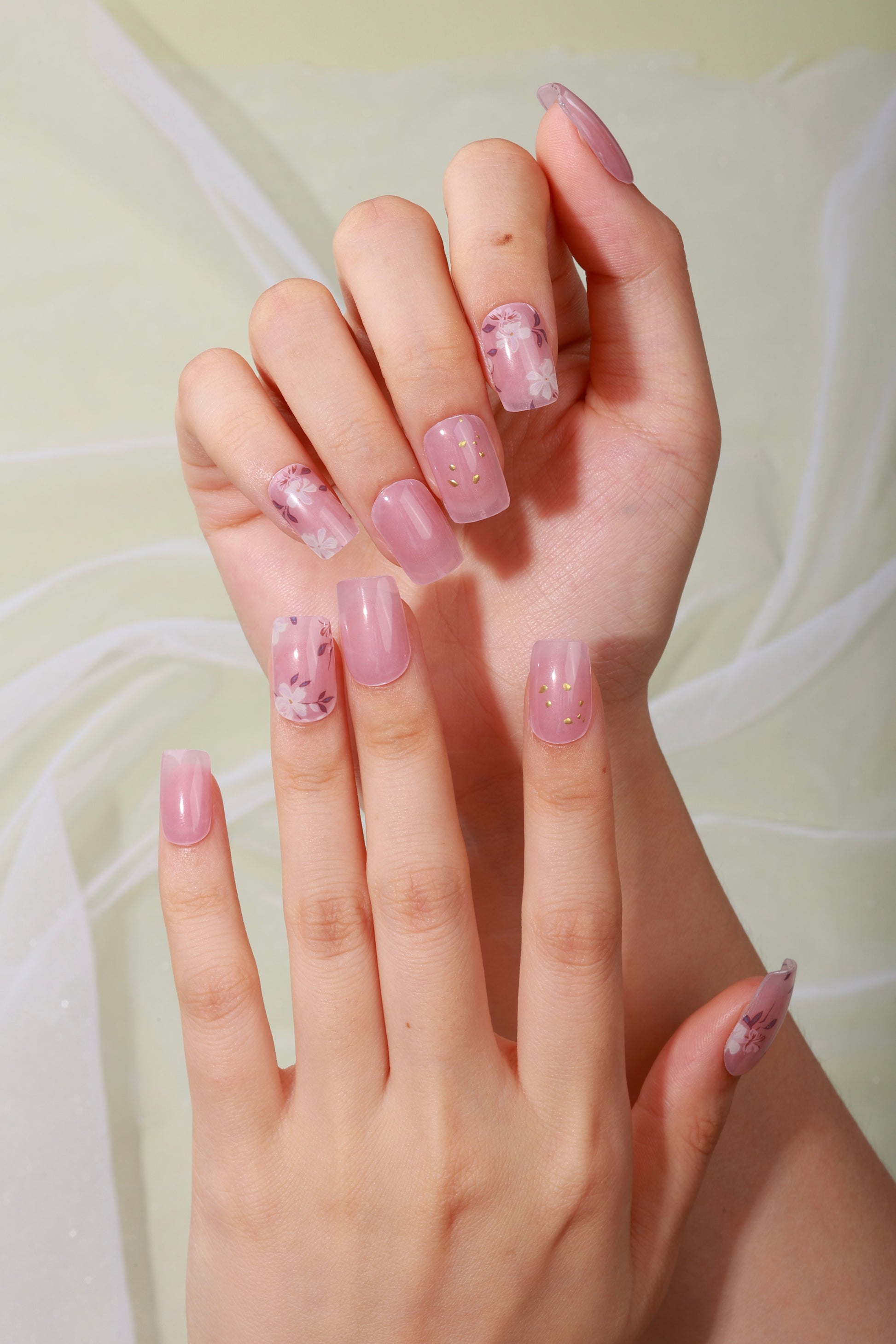 Soft pink base with white blossoms, plum-leaf accents, and scattered gold flakes for a delicate, feminine finish.