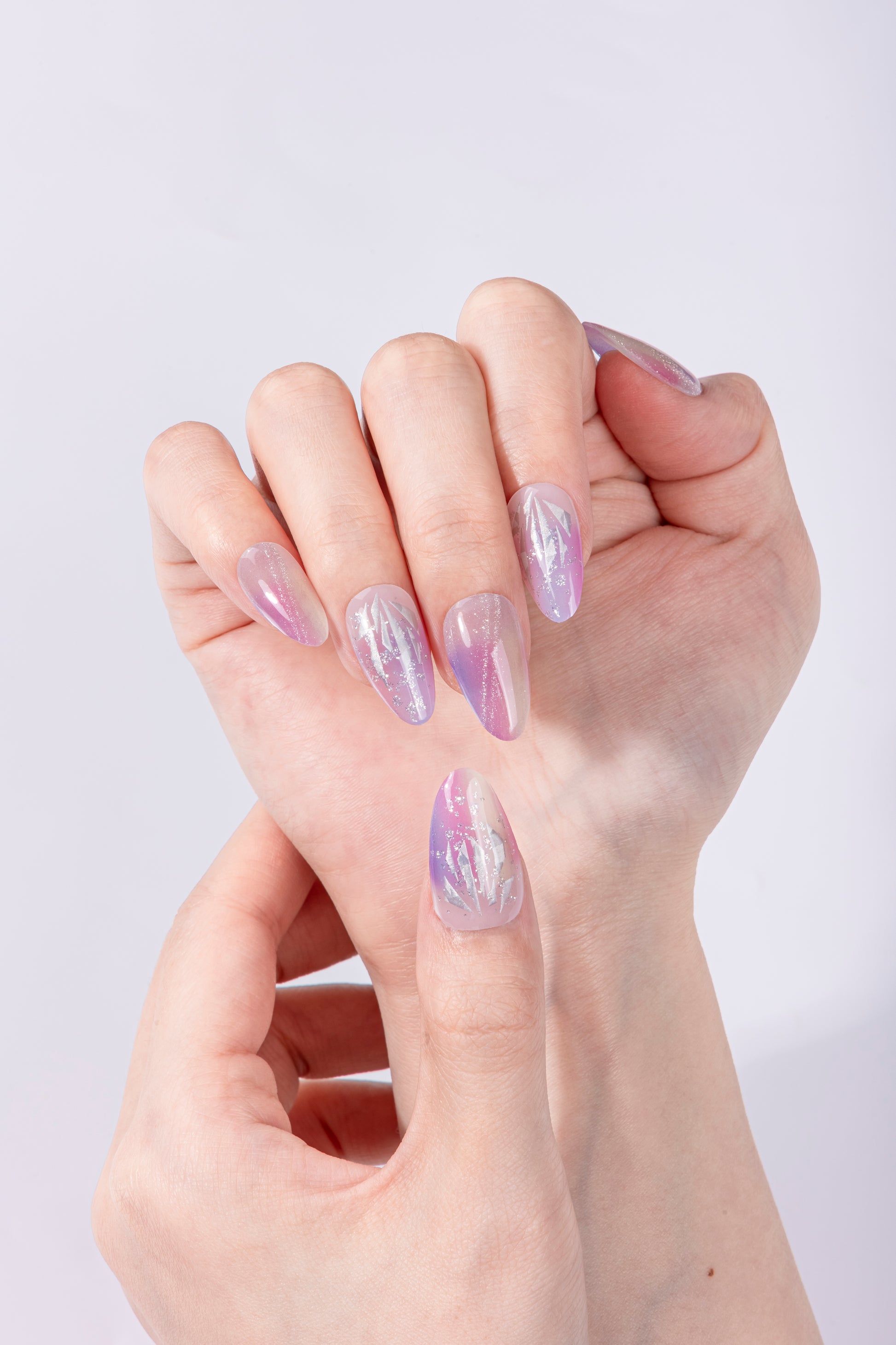Pink-lilac ombré with silver “shattered glass” accents and micro-sparkle for a prismatic aurora finish.