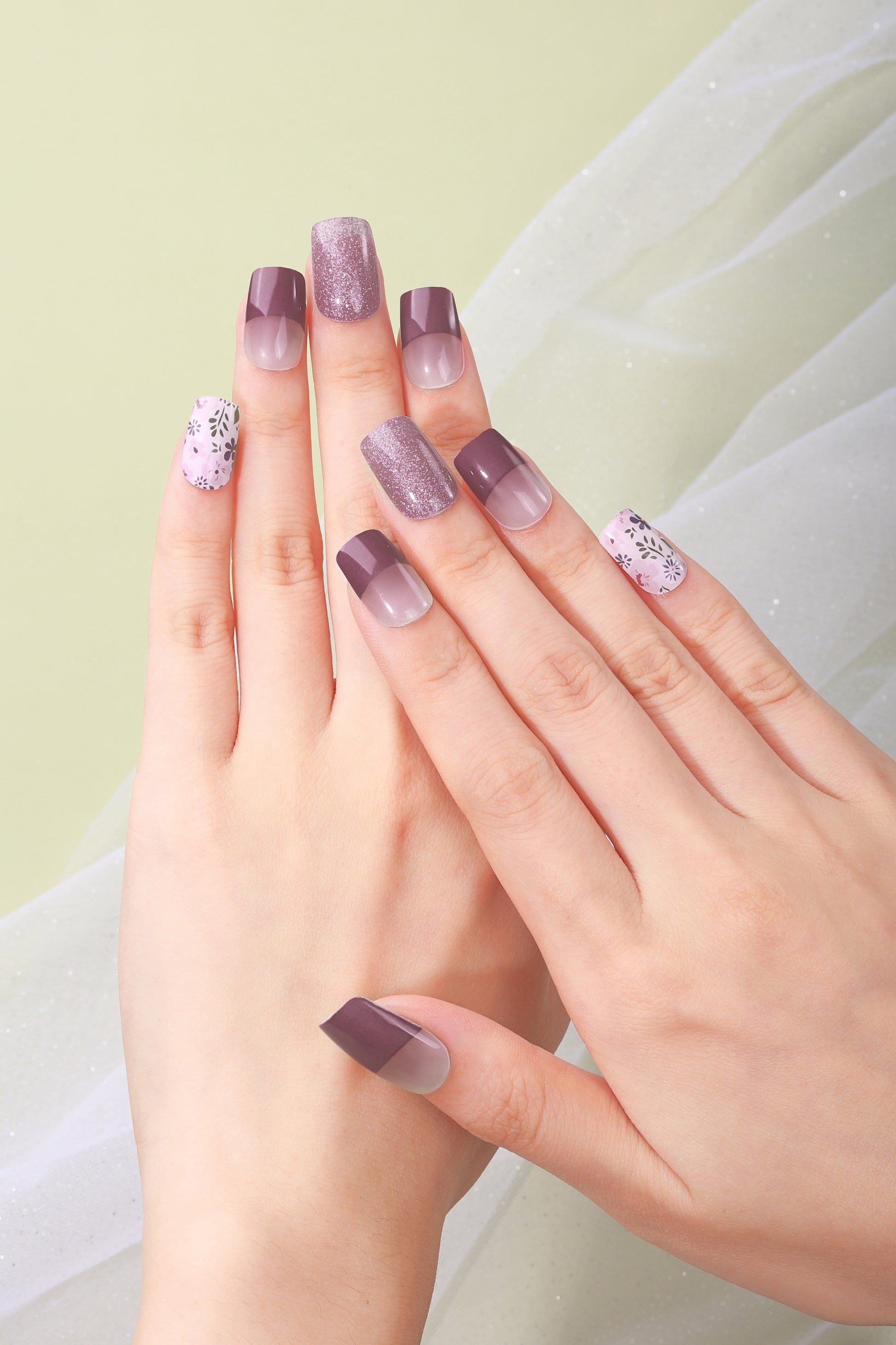 Sheer nude base with bold mauve block tips, a glitter accent, and a single floral nail—elevated, wearable statement.