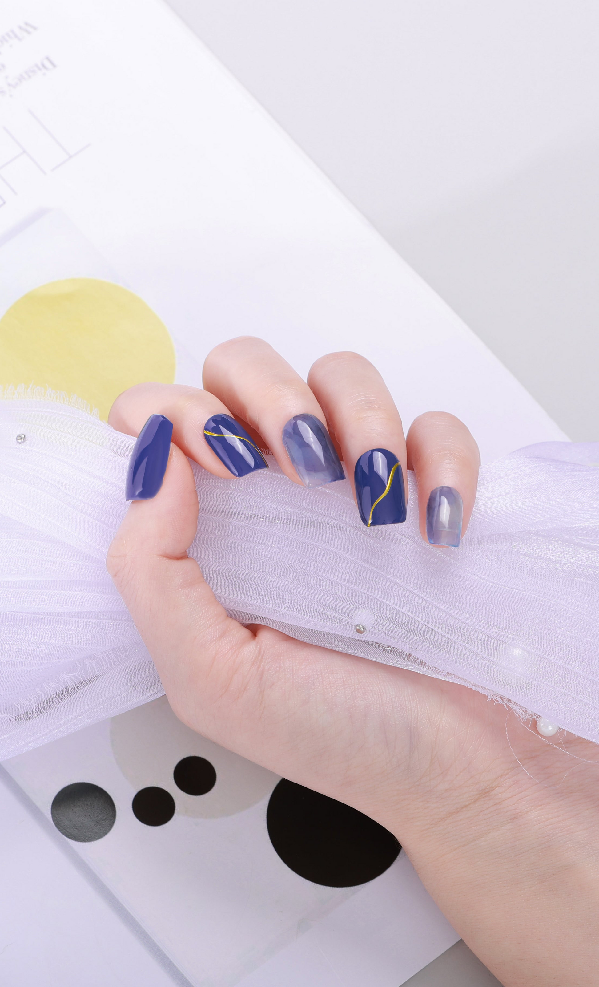 Deep navy with smoky blue marble nails and fine gold-line accents—sleek, modern, statement set.