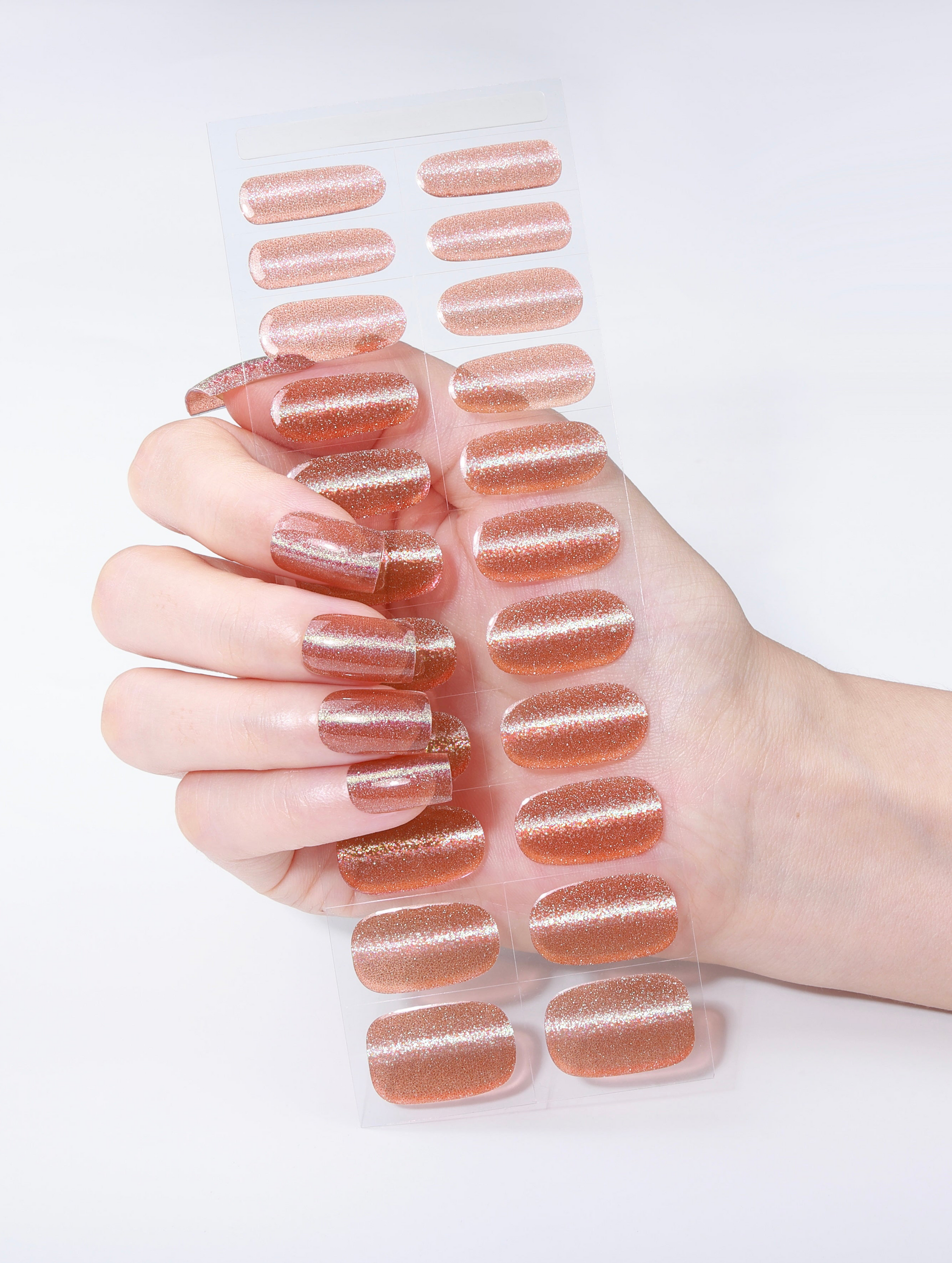 A metallic copper-orange with a radiant shimmer—glamorous, fiery, and perfect for making a bold statement.