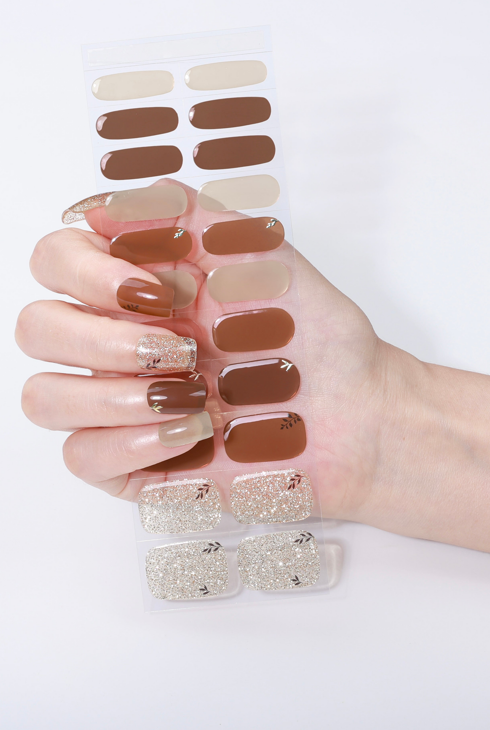 A natural and sophisticated design blending earthy tones with golden sparkle, accented by delicate leaf details that capture the warm essence of autumn.
